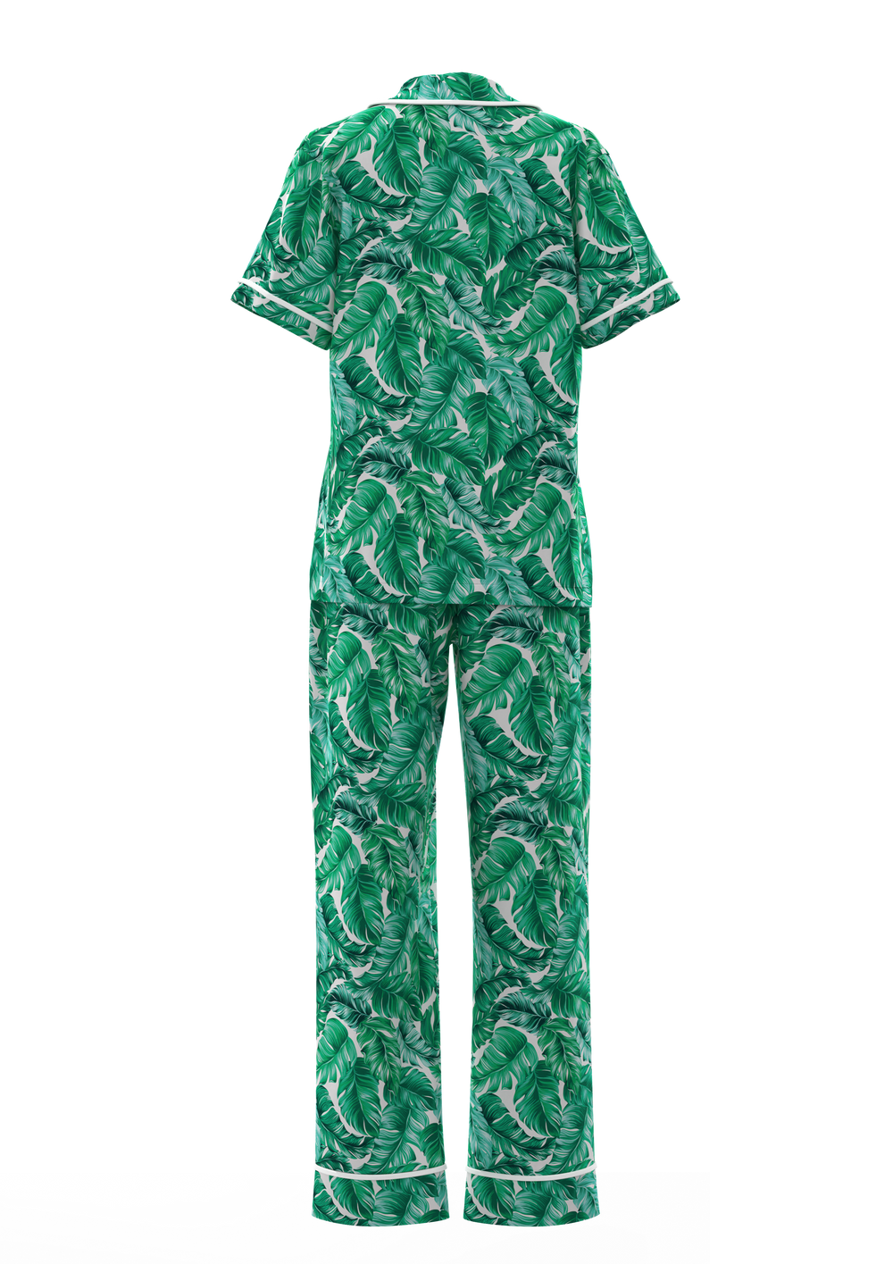 Sleep (and lounge) in style in this contemporary chic woven personalised pyjama set. This woven fabric set features contrasting piped detailing, matching buttons, a collared shirt, short sleeves, and ribbon-tied pants with one pocket.