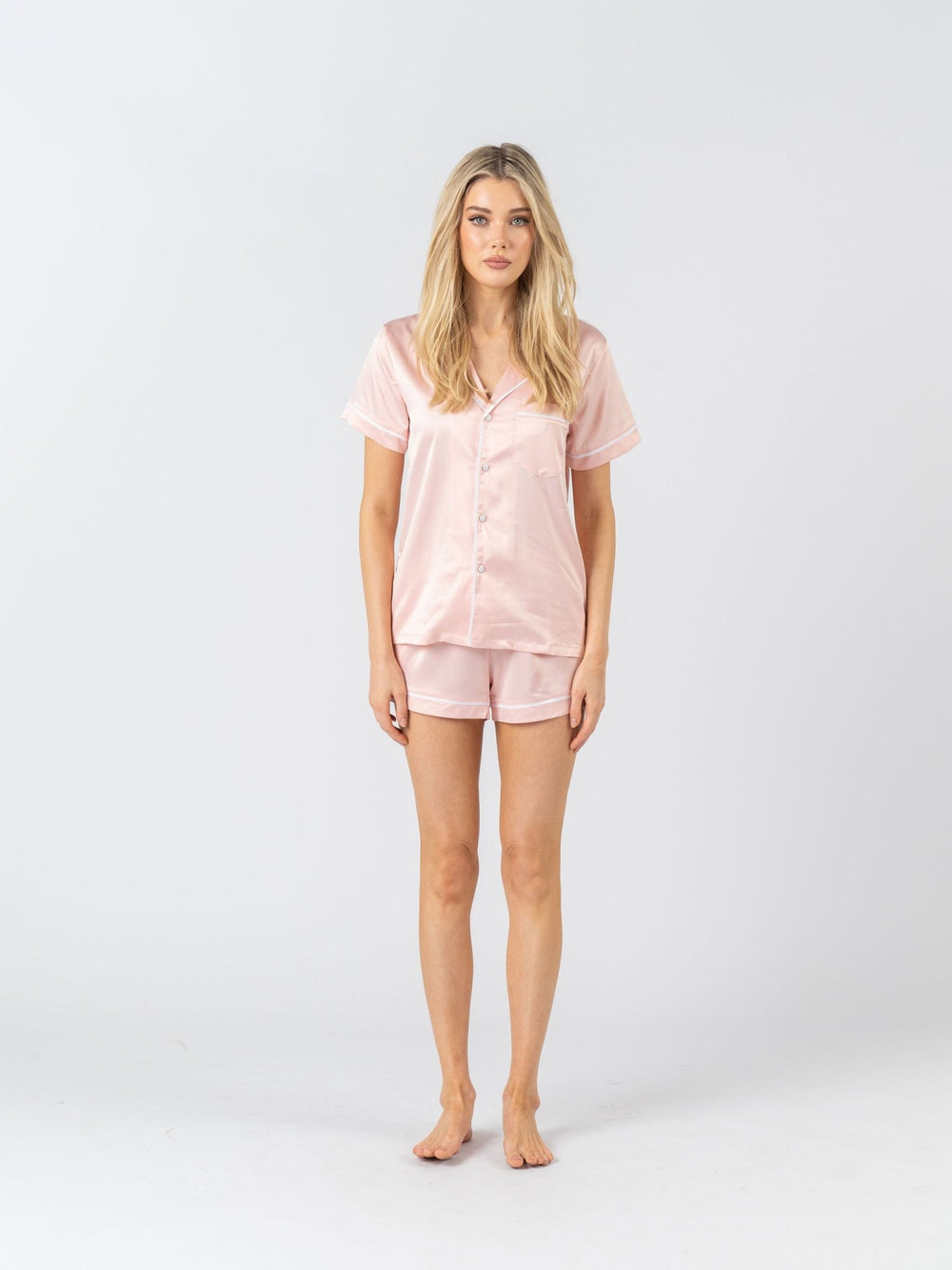 Sleep (and lounge) in style in this contemporary chic satin personalised pyjama set. This soft luxe satin fabric set features contrasting piped detailing with a closed pocket, matching buttons, a collared shirt, short sleeves, and ribbon-tied shorts with one pocket.
