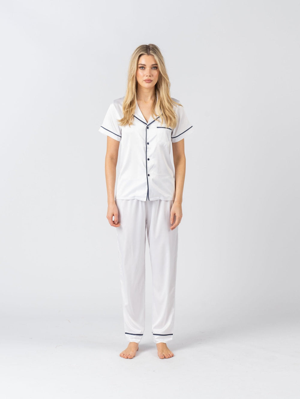 Satin Personalised Pyjama Set - Short Sleeve & Long Pants White/Navy (