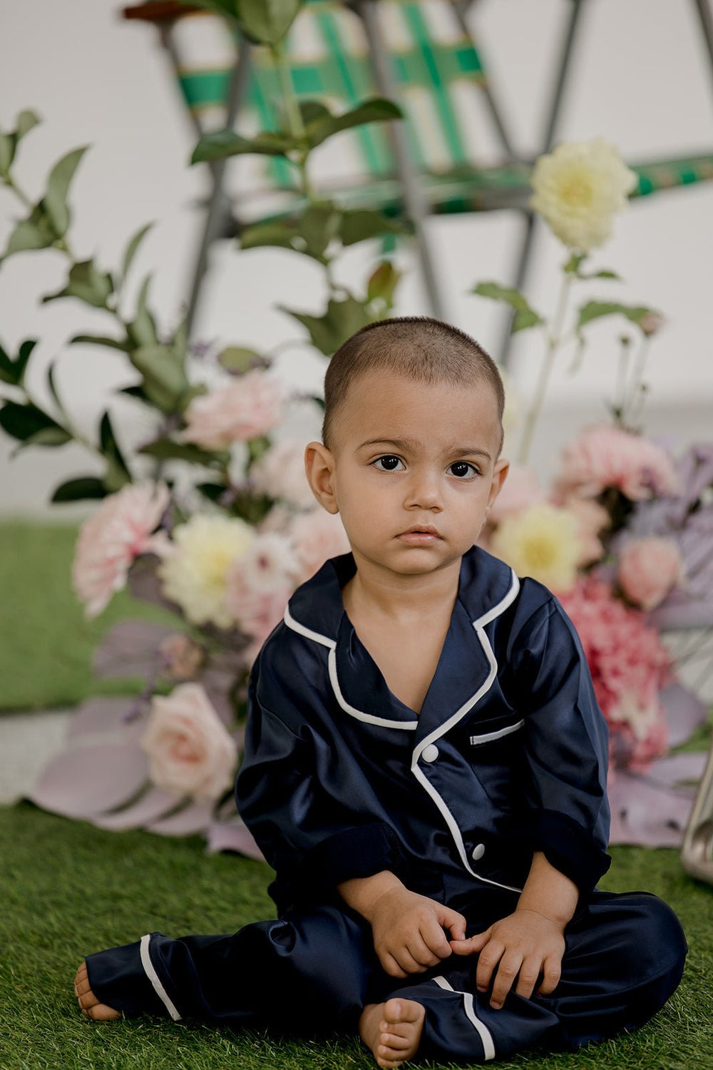 Kids Satin Personalised Pyjama Set - Long Sleeve with Long Pants Navy/