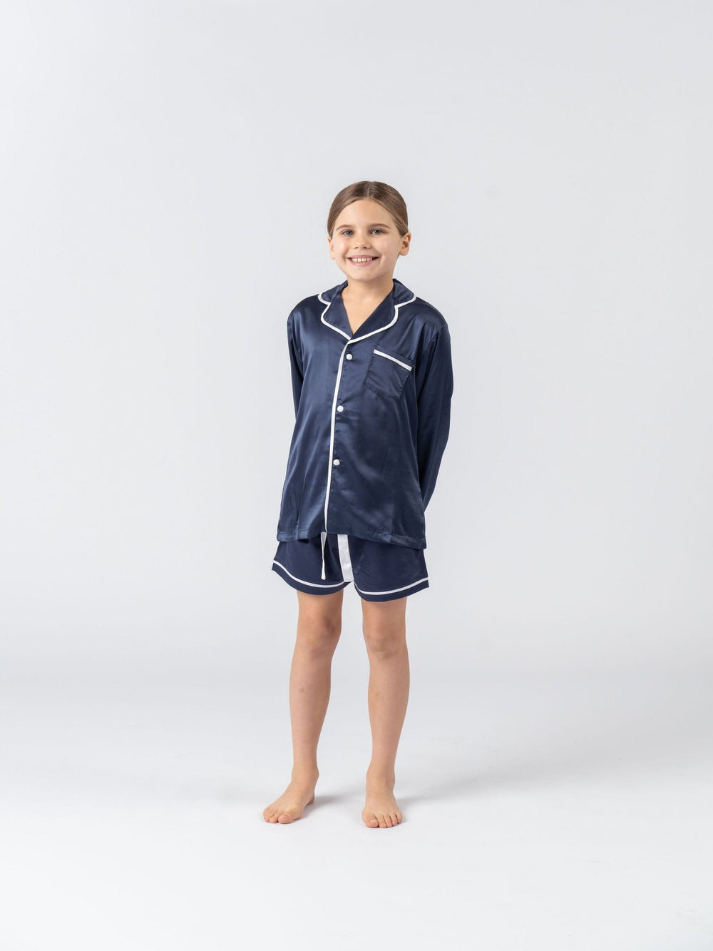 Kids Satin Personalised Pyjama Set - Long Sleeve with Shorts Navy/White