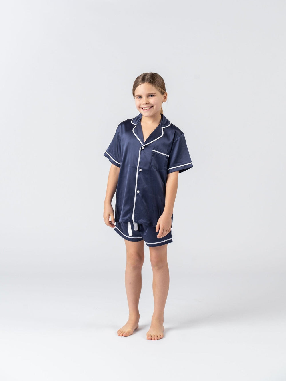 Kids Satin Personalised Pyjama Set - Short Sleeve Navy/White