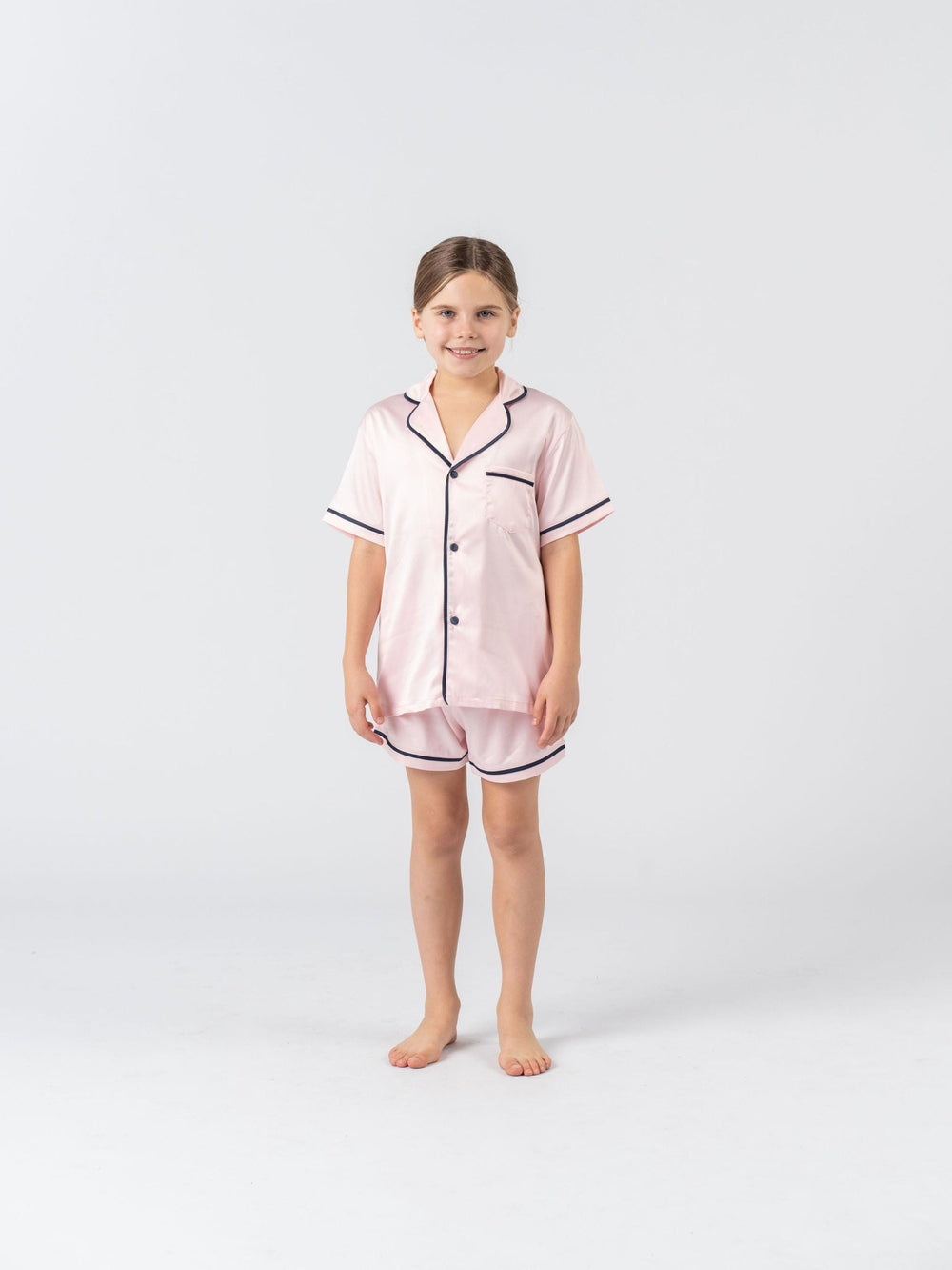 Kids Satin Personalised Pyjama Set - Short Sleeve Pink/Navy