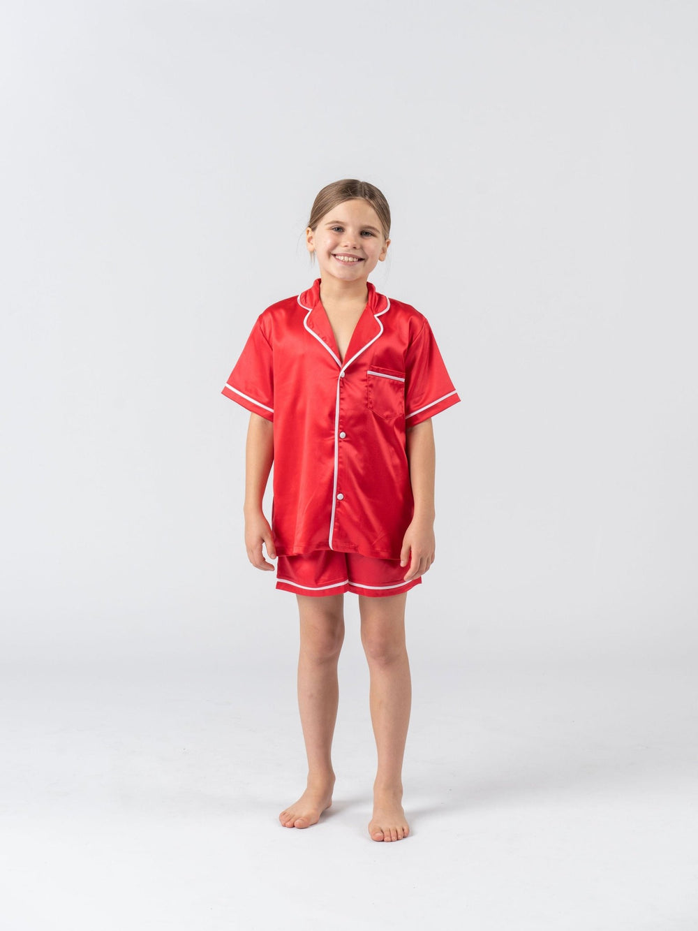 Kids Satin Personalised Pyjama Set - Short Sleeve Red/White