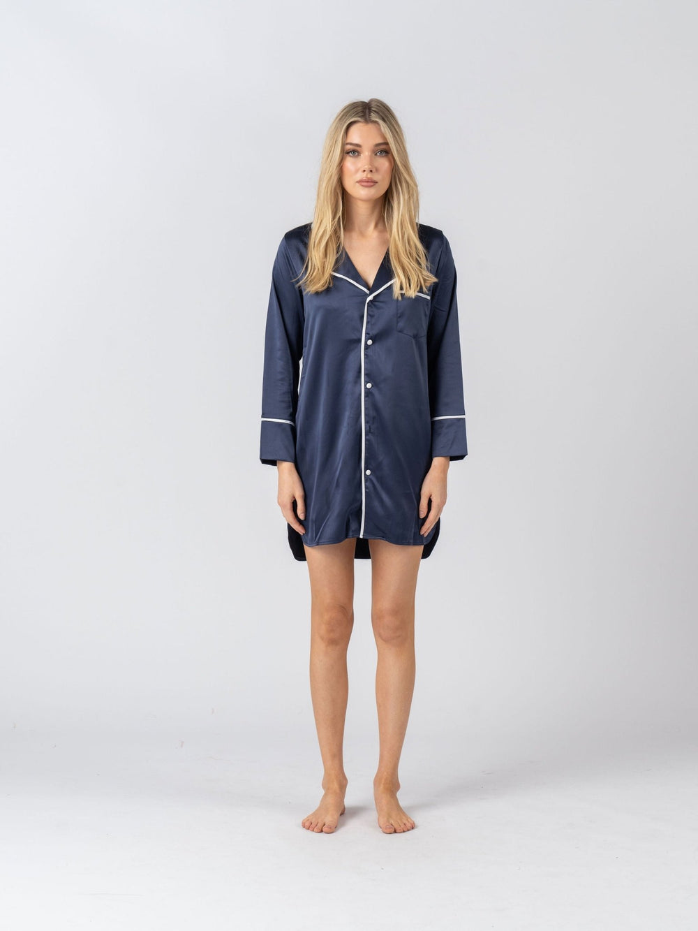 Satin Personalised Long Sleeve Boyfriend Shirt - Navy/White