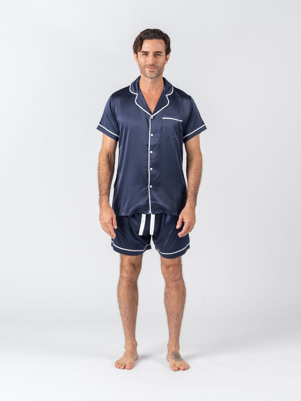 Men's Satin Personalised Pyjama Set - Short Sleeve Navy/White