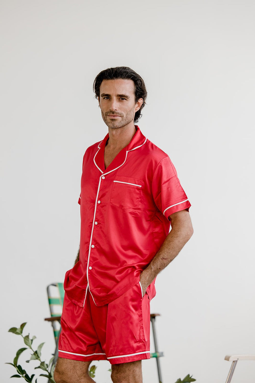 Men's Satin Personalised Pyjama Set - Short Sleeve Red/White