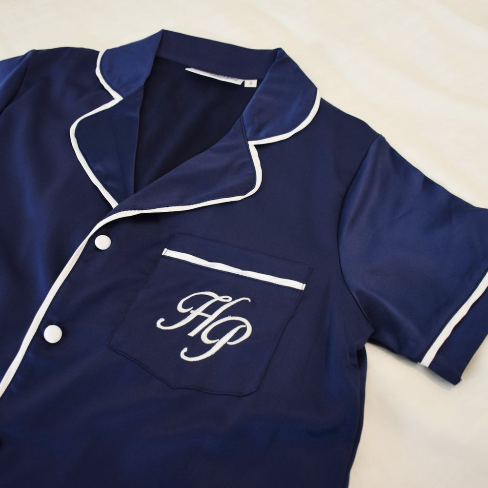 Satin Personalised Pyjama Set - Short Sleeve Navy/White